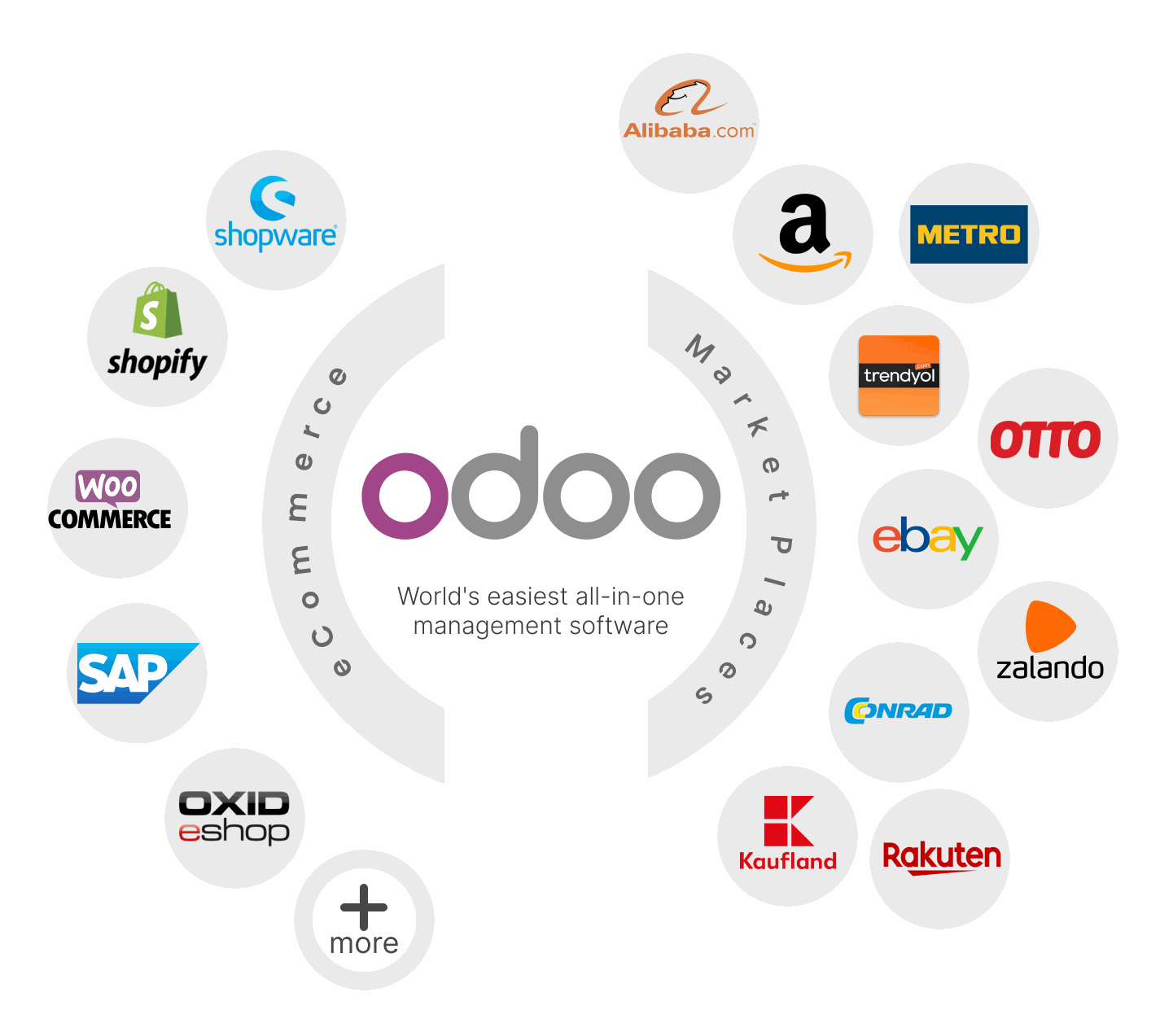 Mi Odoo als zentrale Plattform haben wir EDI-Anbindungen und Konnektoren zu diversen ERP- und eCommerce-Plattformen, Marktplätzen und weiteren Systemen gebaut.